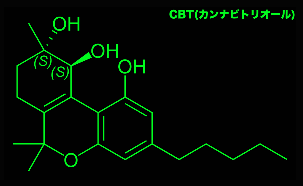 CBT(カンナビトリオール)は、特定の大麻にのみ含まれる天然の植物性カンナビノイドの一つです。大麻中に含まれる量は微量なため、マイナーカンナビノイド若しくはレアカンナビノイドと呼ばれます。市場に出回るCBTは基本的にCBDやCBGなどの他のカンナビノイドから変換されたものになります。CBTはTHCと類似した化学構造を有しています。