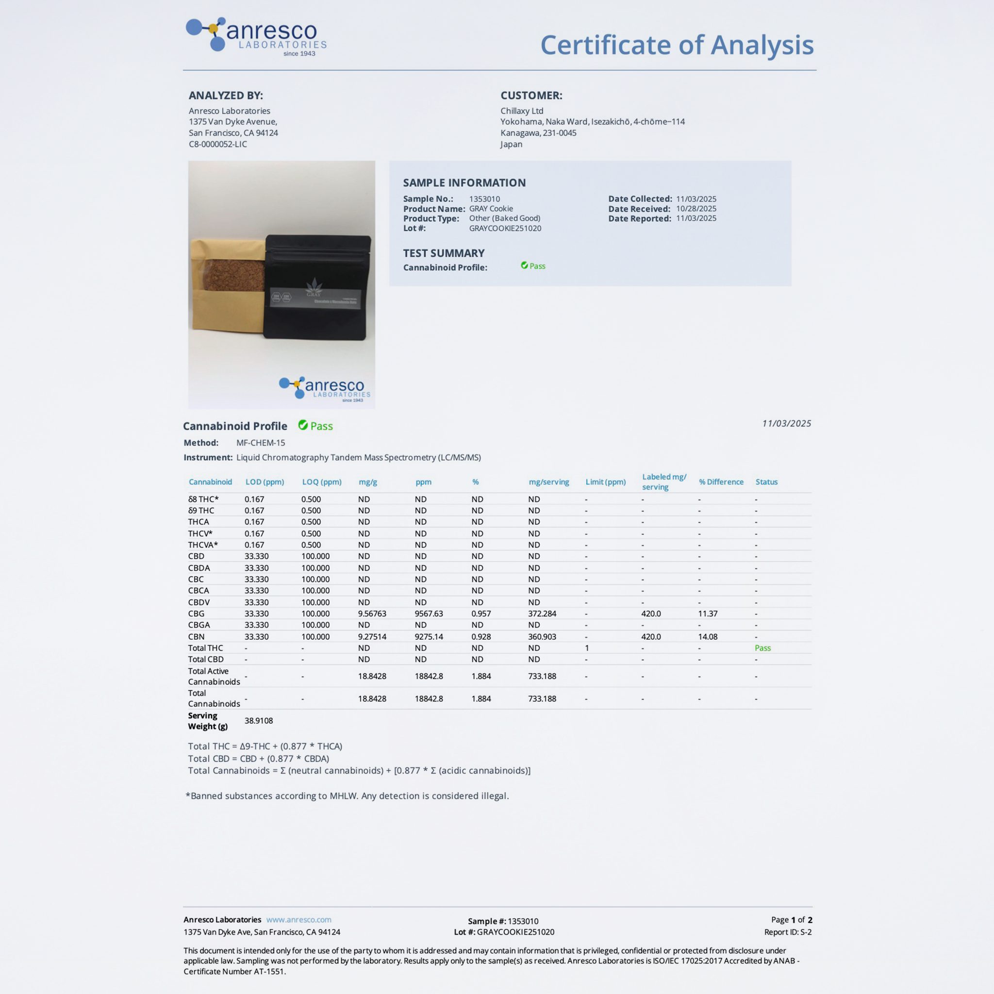 ・原材料:小麦粉(国内製造)、砂糖、バター、マカダミアナッツ、卵、チョコレートパウダー、CBN、CBG、ベーキングパウダー、香料